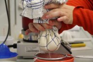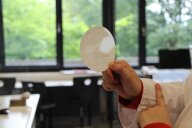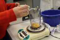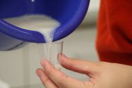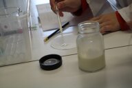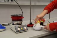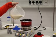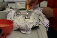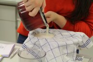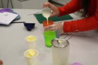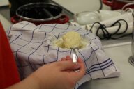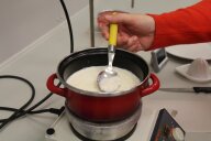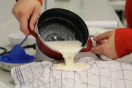 Im zweiten Experiment stellen die Kinder Quark her. Dazu fügen sie Zitronensaft zu den 500ml fettarmer Milch, die sie zuvor auf 35° erhitzt haben, und lassen die Milch 20 Minuten weiter „köcheln“. Danach wird alles durch ein, mit Küchentuch ausgelegtes Sieb, abgegossen und probiert. Der warme Quark schmeckt den Kindern auch nicht.