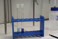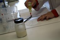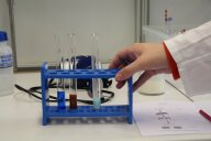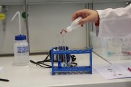 Nach der Mittagspause ist es endlich so weit. Die beiden dürfen ihre Kittel und Schutzbrillen anziehen und finden sie „sehen sehr professionell aus, wie Wissenschaftlerinnen“! Wir wechseln den Raum und gehen ins Labor. Hier geht es darum, wie sie Fett, Eiweiß und Zucker erkennen und in der Milch nachweisen können. Sie gehen sehr achtsam mit den Arbeitsmitteln (Reagenzgläsern und Pipetten) um und haben großen Respekt vor dem Umgang mit Chemikalien (Wasser, Öl, Eiweißlösung, Milchzuckerlösung, Fehling I- und II-Lösung, Natriumhydroxid-Lösung) und waschen sich zur Sicherheit lieber einmal mehr als zu wenig die Hände. Mit der Biuret-Reaktion weisen die beiden das Eiweiß in der Milch nach; mit der Fehling-Reaktion Zucker.